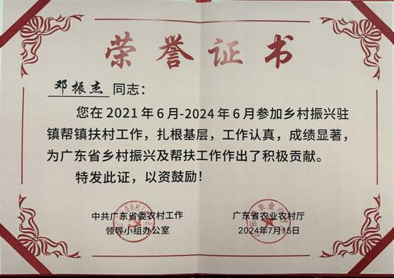 鄧振杰同志獲中共廣東省委農(nóng)村工作領(lǐng)導小組辦公室、廣東省農(nóng)業(yè)農(nóng)村廳表揚